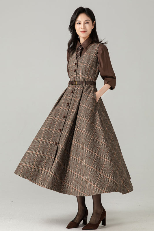 Plaid Wool Pinafore Dress: Vintage A-Line Button-Front Dark Academia Style, Ylistyle C5369