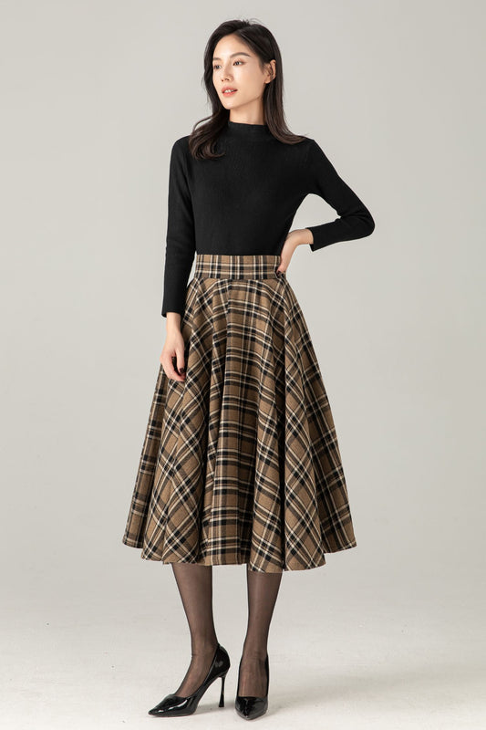 Wool Blend Plaid Midi Skirt : High Waist Swing Circle Skirt, Ylistyle C5375