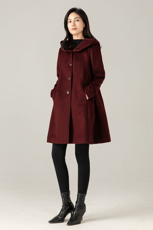 Burgundy Wool Blend Hooded Coat: A-Line Mid-Length Winter Overcoat, Ylistyle C5377