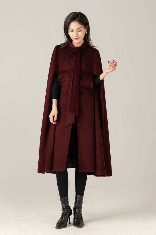 Burgundy Wool Blend Cape Coat: Women Long Winter Cape Outerwear, Ylistyle C5378