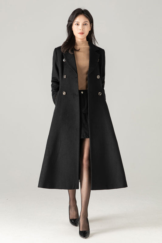 Black Wool-Blend Maxi Coat: Double-Breasted Belted Swing Overcoat, Ylistyle C5372