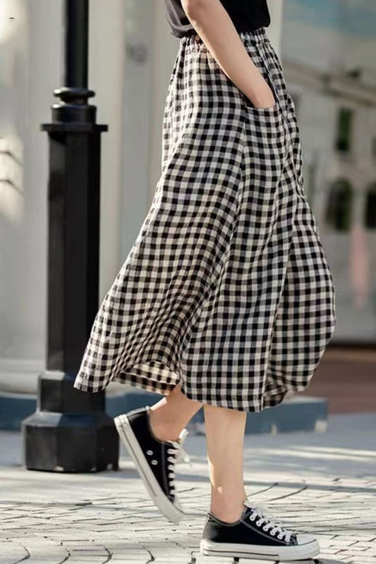 Art Casual Black White Grid Pants Cotton Women Clothes TT0042