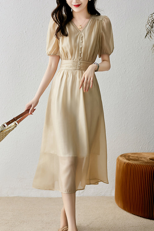 High waisted bubble sleeved V-neck mid length dress C3467