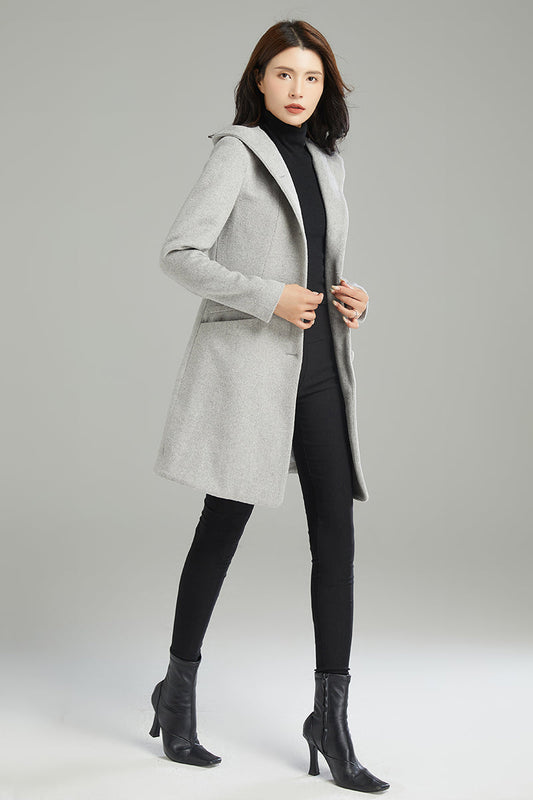 Winter Gray Hooded Wool Coat C2990#,Size 170-XS CK2202236