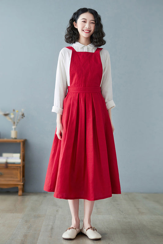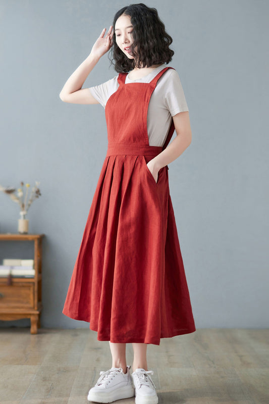 Women Summer Sleeveless Pinafore Red Linen A line Dress C2725#CK2200197
