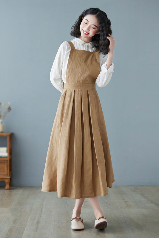 Linen Pinafore Summer Khaki Suspender A-line Dress C2727#CK2200219
