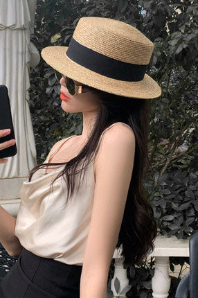 Flat Top Hat Women's Summer Straw Hat Woven Beach Hat C2906