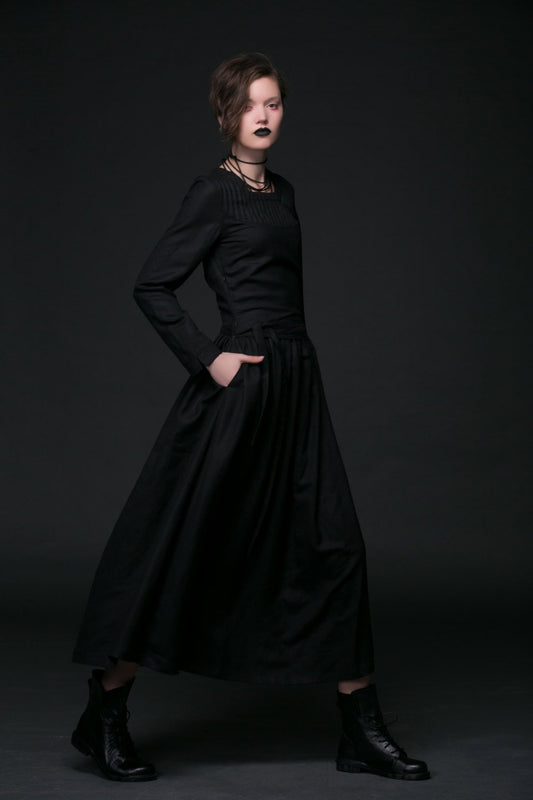 Black Linen Dress - Maxi Goth Style Long Sleeved Fit & Flare with Tie Belt Women's Handmade Clothing C513