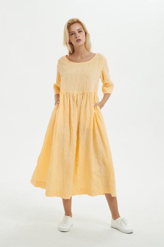 Yellow linen dress, midi womens dress for summer - dress for women, plus size linen dress with pockets, loose & casual pleated dress C1279