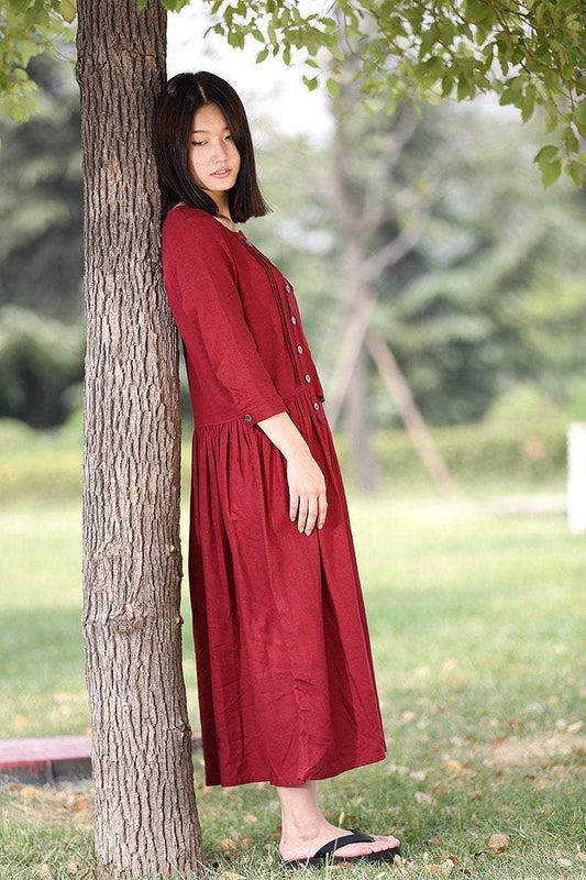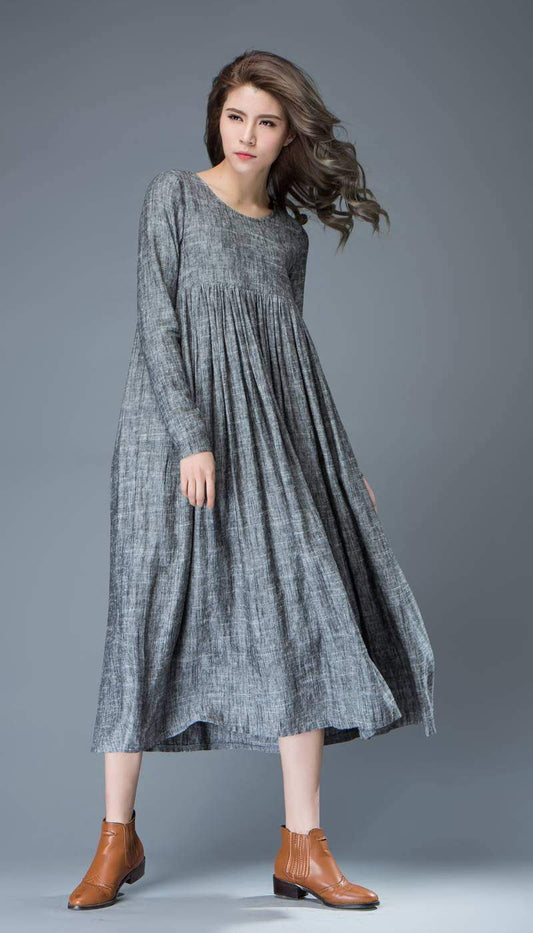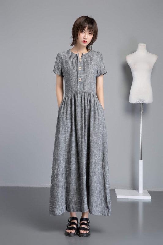 Gray pleated & buttons Long linen dress C1252