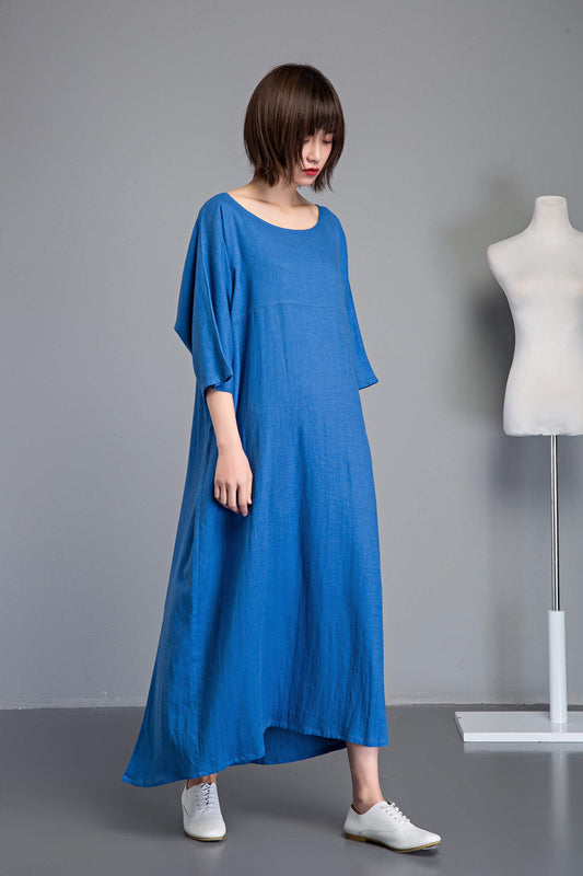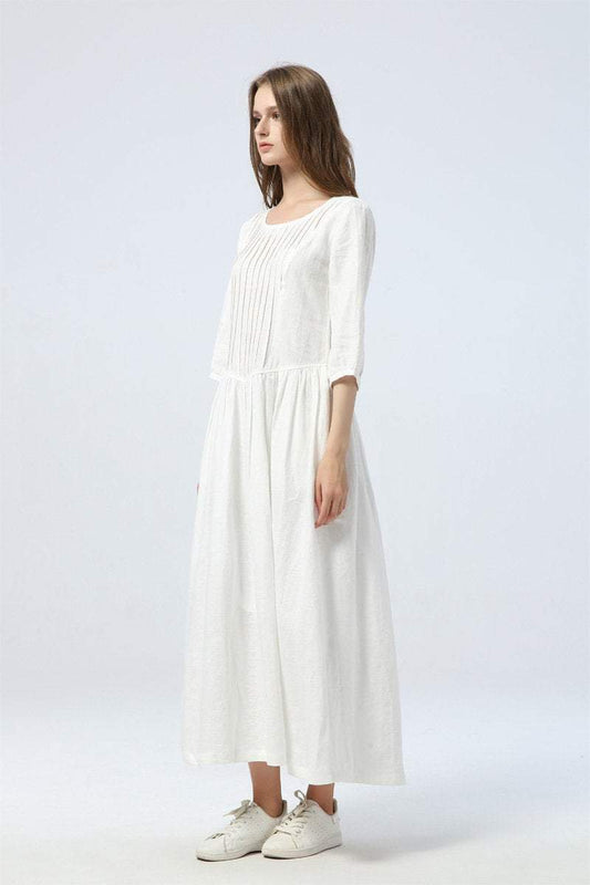 long white dress, summer linen dress for womens - loose & casual dress, elbow sleeve dress with pleats, fashion oversized long dress C1285