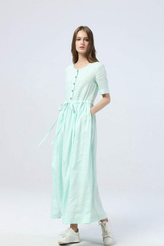 mint green dress, long linen dress for summer, drawstring skirt with buttons, women's dress with pockets - maxi dress & gift for her C1284