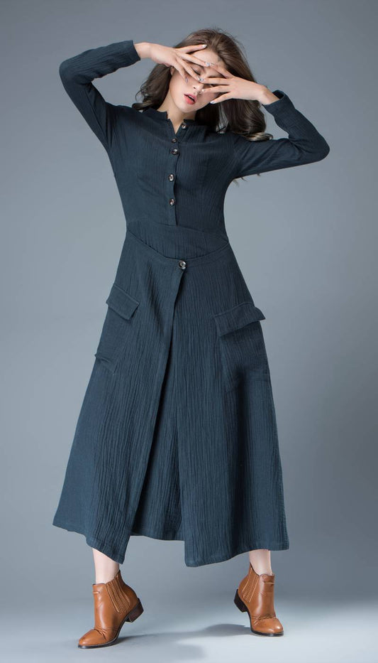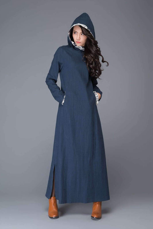 Blue Linen dress, maxi dress, linen dress, womens dresses, causal dress, hoody dress, long sleeved dress, maxi linen dress, long skirt C1011