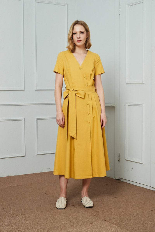 Yellow midi shirt dress, linen shirt dress, V Neck buttons mid dress, womens linen dress, Ylistyle linen midi shirt dress C1476