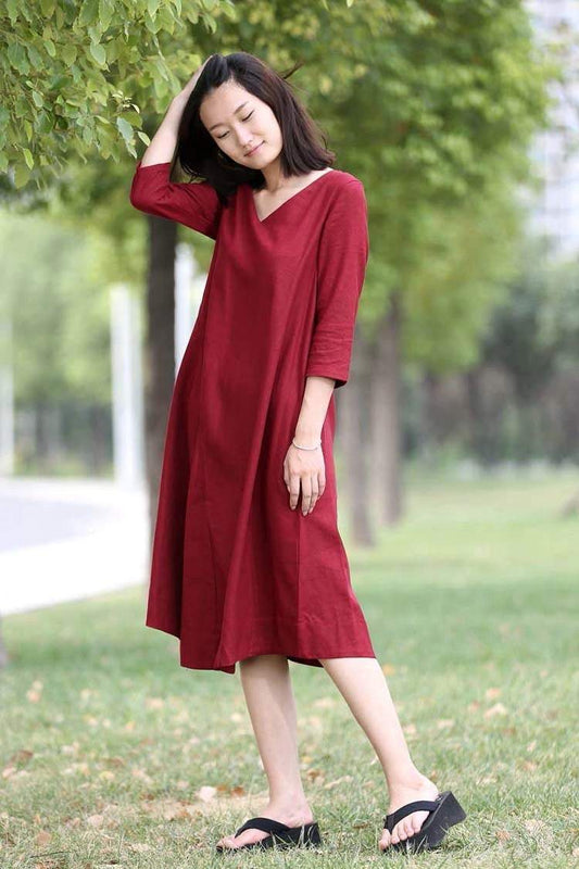 Red Linen Dress - Midi Length Loose-Fitting Plus Size V-Neck Casual Everyday Comfortable Womens Clothing C264