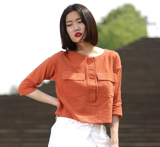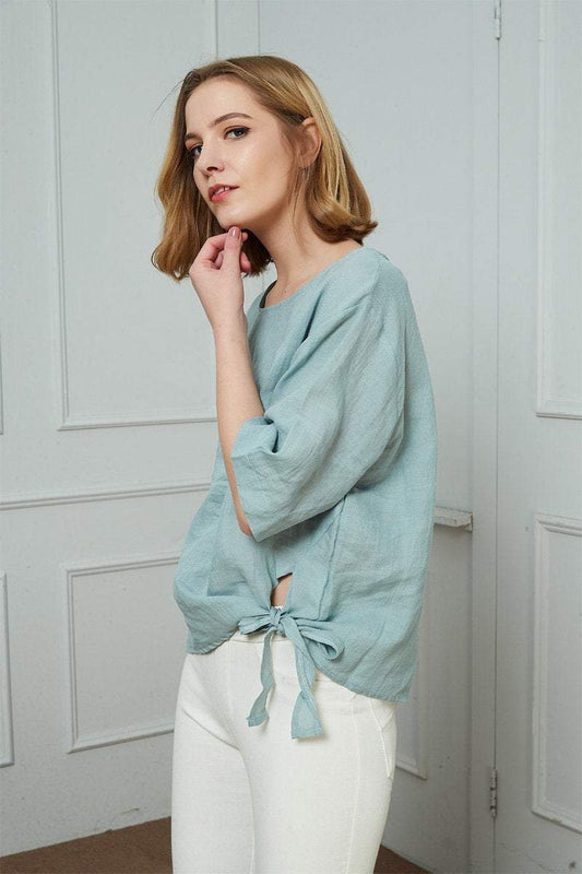 Oversized linen top, Back-Button Short-Sleeve Top, Button linen top, blue linen top, womens linen top, summer linen top C1478