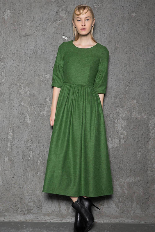 Simple Wool Dress - Emerald Green Elegant Feminine Minimal Contemporary Pleated Long Woman's Dress with Three-Quarter Sleeves C727
