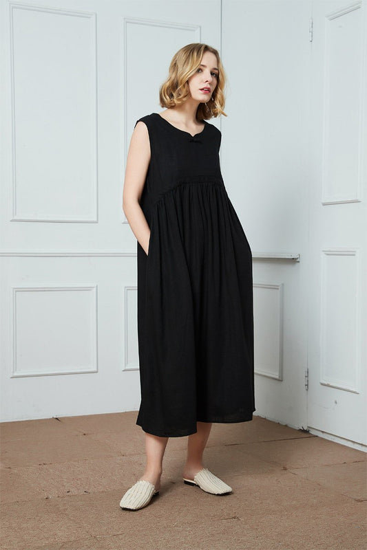 Linen dress, Linen sleeveless dress, black dress womens dresses, mid-length dress, pockets dress, pleated dress C1410