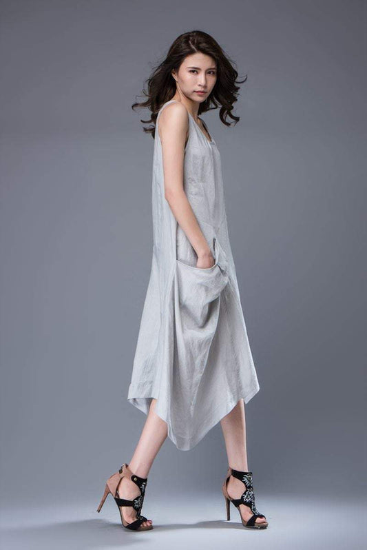 Gray Linen Dress - Sleeveless Asymmetrical Pale Grey Feminine Summer Dress with Large Pockets C889