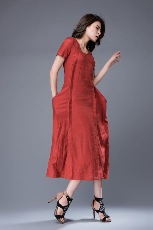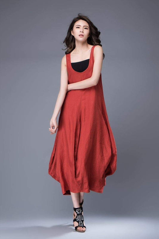 Red Linen Dress - Free-Style Casual Loose-Fitting Tulip-Shaped Everyday Modern Contemporary Unique Designer Dress C888