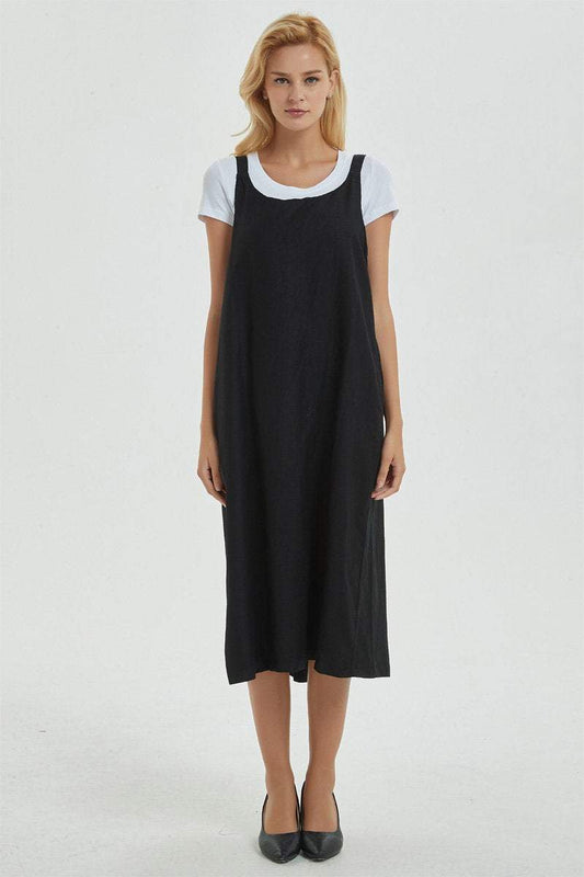 black pinafore dress, linen dress, loose and casual dress for womens- plus size & sleeveless dress with pockets, cuatom fashion dress C1287
