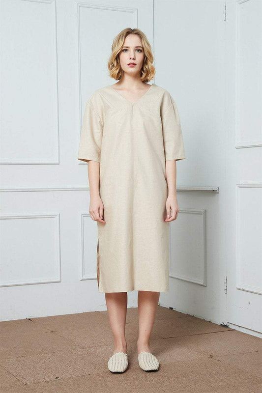 Simiple linen dress, summer dress, everyday dress, v-neck Linen Dress, oversized linen dress, Linen Kimono Sleeve Dress, beige dress C1424