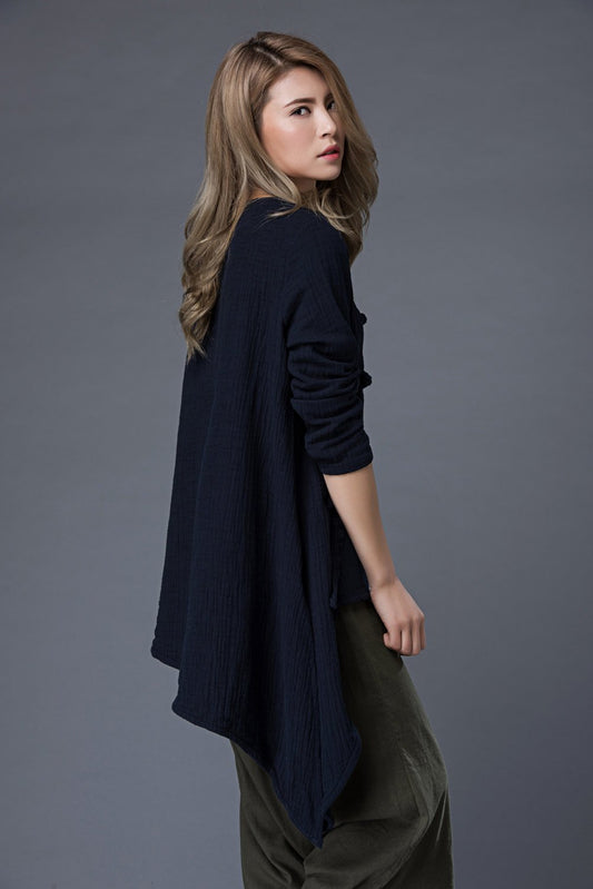 long sleeves top, casual top, summer top, loose blouse, linen top, blue top, asymmetrical shirt, loose blouse, classic shirt C857