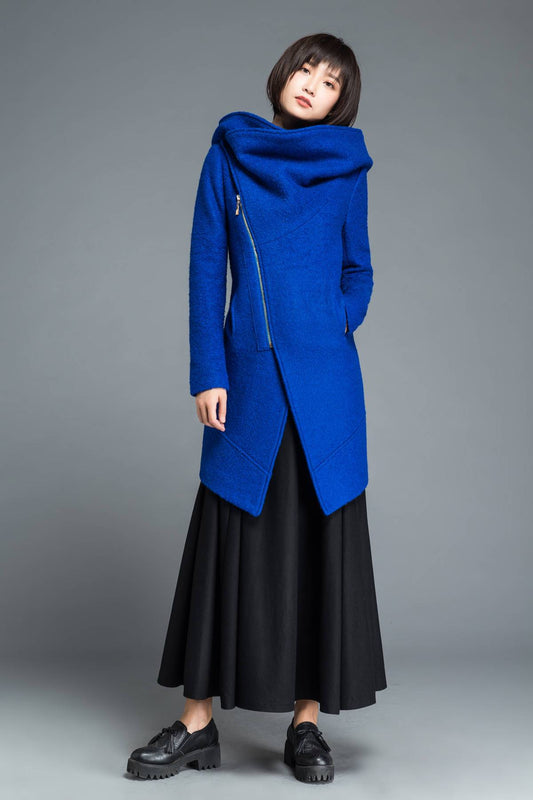 Womens coat, wool coat, blue coat, winter coat, asymmetrical coat, hoody coat, cowl neck coat, plus size coat, winter wool coat C1212