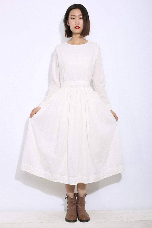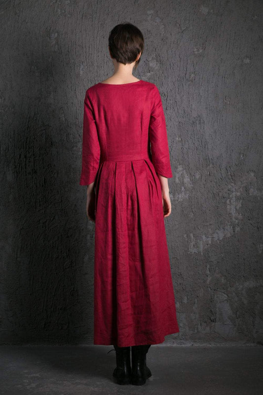Red Linen Maxi Dress - Raspberry Fit & Flare with Pintuck Pleated Waist Summer Fall Fashion Womens Dress (C500)
