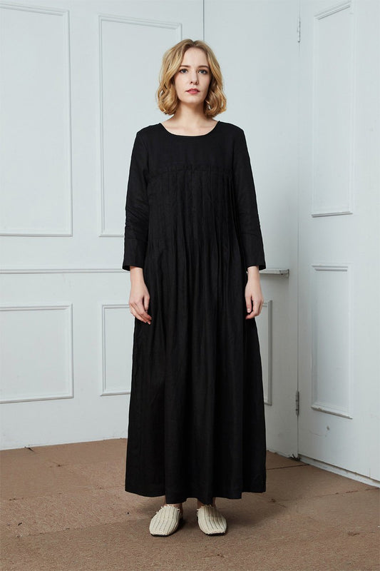 Linen dress, black linen dress, linen pleated dress, maxi linen dress, womens dresses, linen casual dress, pockets dress C1412