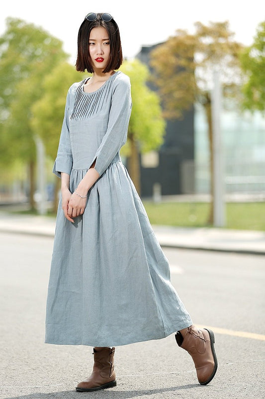 Blue Linen Dress - Long Maxi Casual Summer Loose-Fitting Comfortable Woman's House or Everyday Dress C359