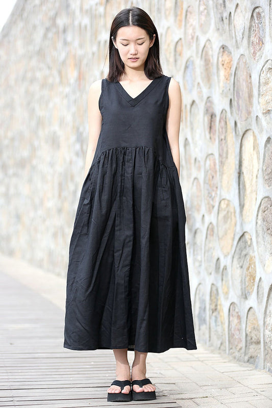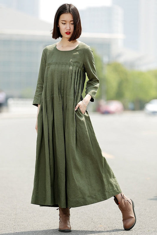 Green Linen Dress, linen dress, long linen dress, Pleated dress, loose linen dress, womens dresses, dress with pockets, plus size dress C358