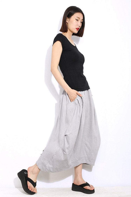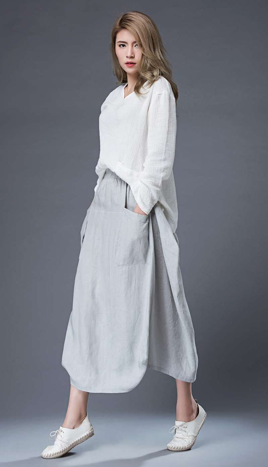 Modern Linen Skirt - Gray Handmade Designer Contemporary Everyday Casual Woman's Skirt with Drawstring Waist Plus Size (C326)