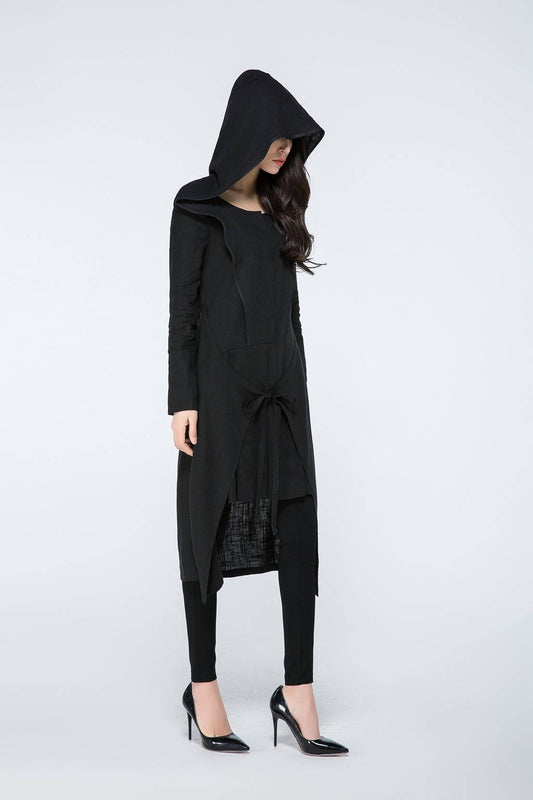Midi Hooded Black Linen Long Sleeves Dress C1075