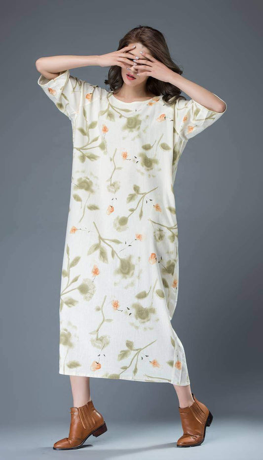 Flower print dress, maxi linen dress, womens dresses, long dress, t shirt dress, shift dress, oversize dress, plus size dress, handmade C812