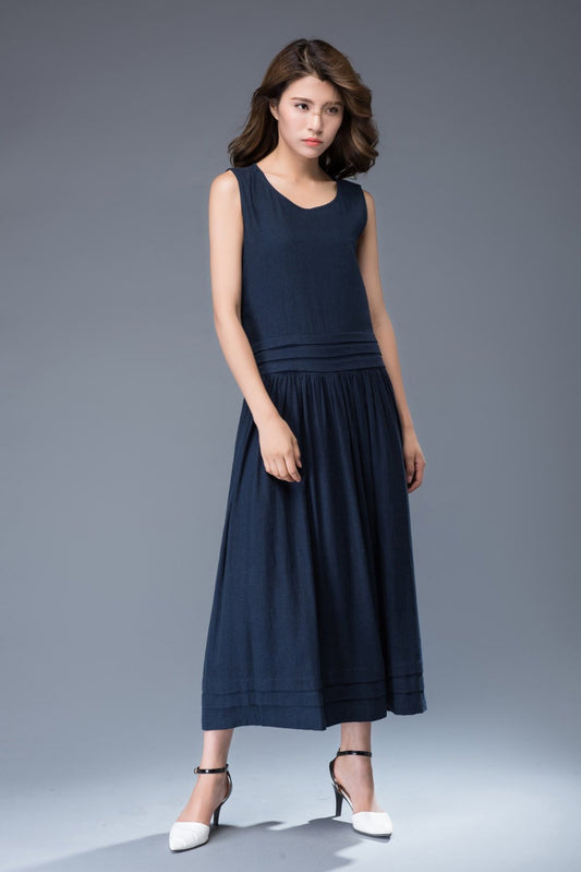 Linen Maxi Dress – Plain Classic Navy Blue Long Sleeveless Fitted Fit & Flare with Bow Tie at the Back and Pockets C938