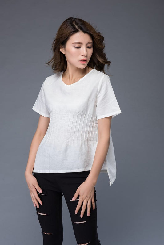 White top, linen top, summer shirt, womens blouse, asymmetrical tops, short shirt, casual top, v neck top, white tee, handmade top C948