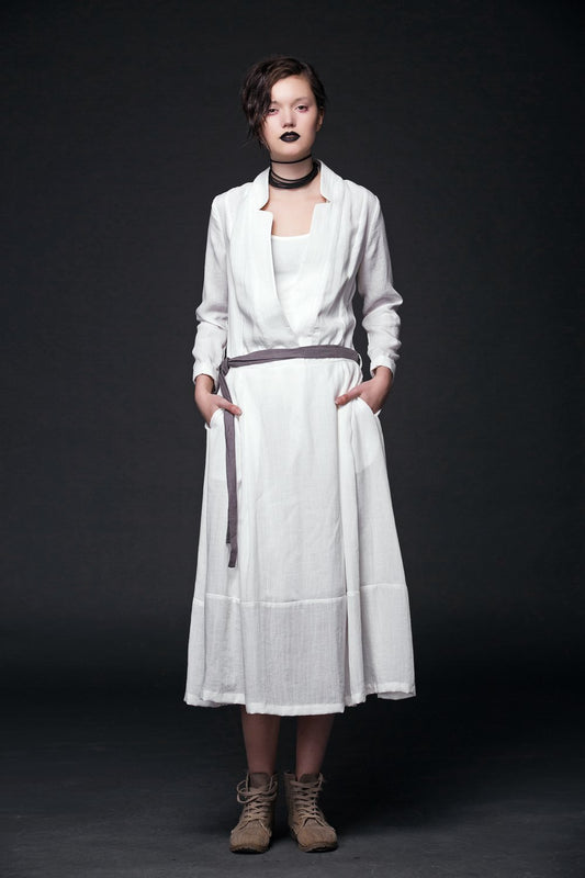 White Linen Dress - Maxi Long Open Neck Long Sleeve with Tiered Skirt & Tie Belt Womens Dress (C515)