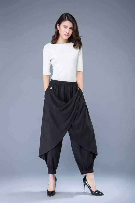 Wrap pants, linen pants, black harem pants, baggy pants, hippie pants, capri pants, black capri pants, elastic waist pants C1054