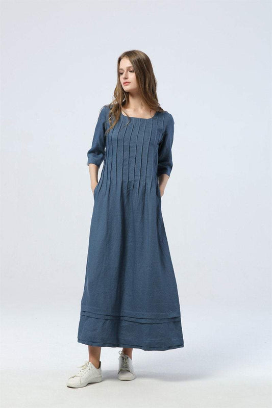 blue pleated dress, long linen dress with pockets, loose&casual dress - women dress - elbow sleeve dress, custom dress for women C1283