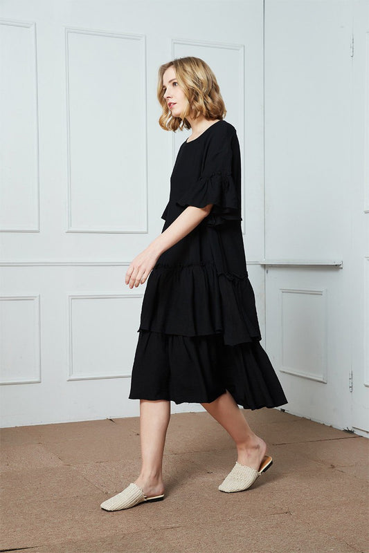 Black cotton ruffle dress, oversized cotton dress, midi dress, womens dresses, summer dress C1407