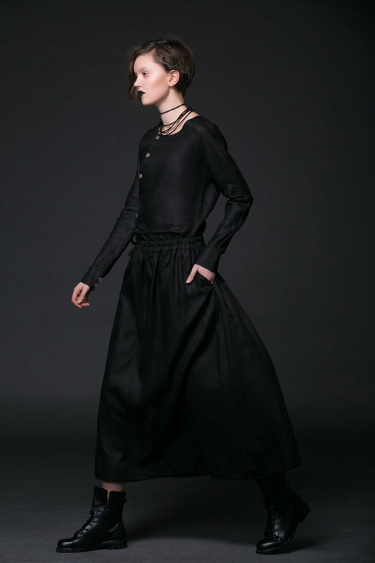 Modern Linen Dress, maxi dress pockets, womens dresses, black dress, Drawstring dress, long sleeved dress, fall dress, handmade dress(C507)