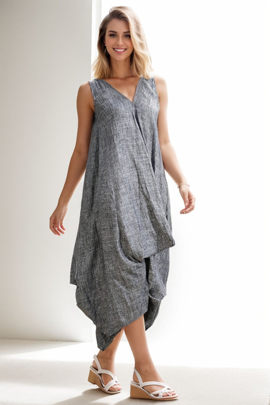 Grey Loose-Fitting V neck Linen Dress C257