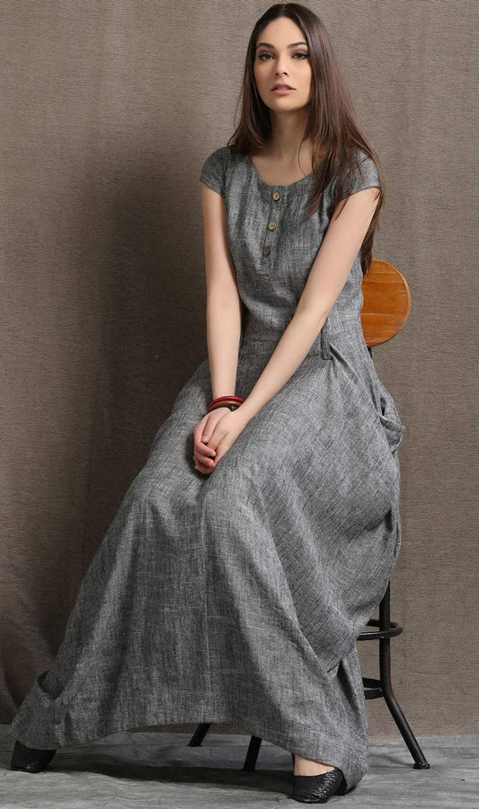 Gray Linen Dress - Long Maxi Boho Style Short Sleeved Shift Dress with Two Large Pockets Spring Summer Fashion (C427)