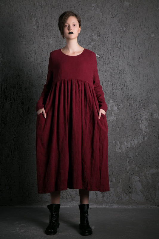 Red Linen Dress – Long Burgundy Loose-Fitting Long-Sleeved Designer Dress with Pockets Plus Size Clothing (C496)