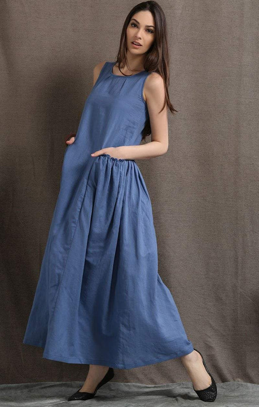 Maxi Linen Dress - Blue Long Casual Comfortable Sleeveless Women's Summer Dress with 2 Large Pockets C426