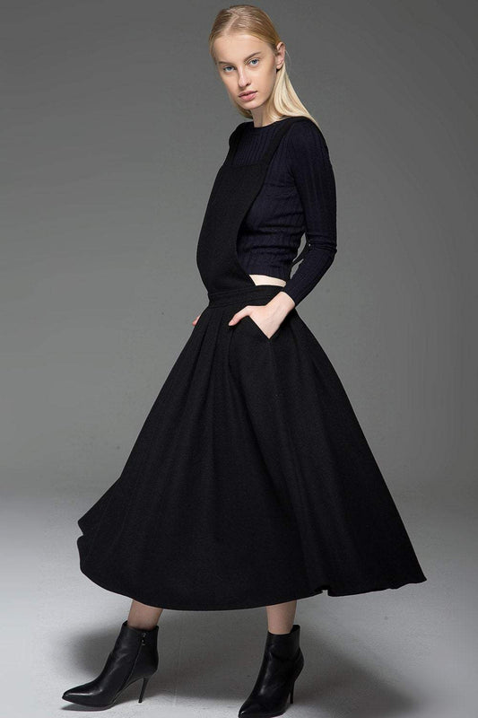Black Dress, wool dress, Pinafore Wool Modern loose casual Midi Length Flared Skirt & Braces Straps Dress 2016 Fashion Season C777