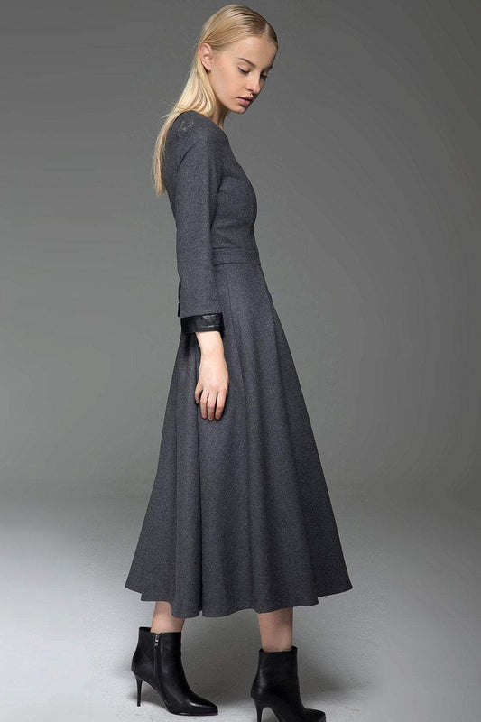 Gray Wool Dress, Classic Long Fitted Tailored Warm Winter Dress with Long Sleeves Round Neck & Black Leather Cuffs C780