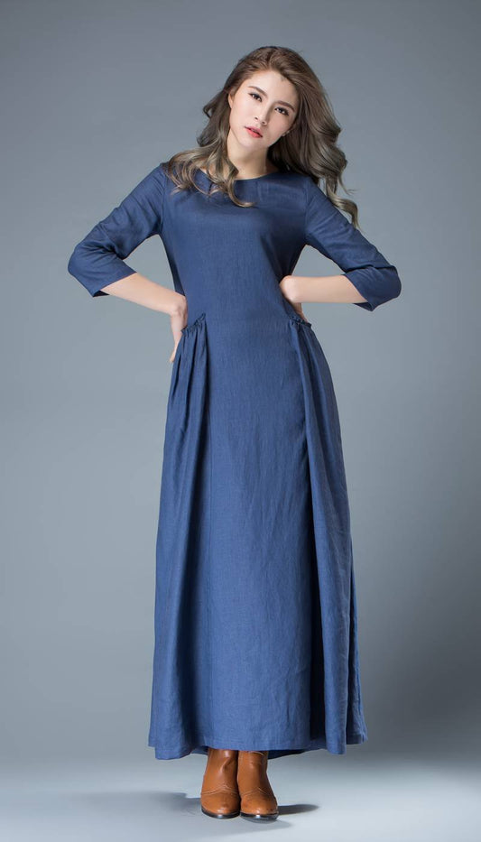 Maxi Blue Linen Dress - Cobalt Long Spring Summer Handmade Casual Everyday Woman's Dress with Half Sleeves C803