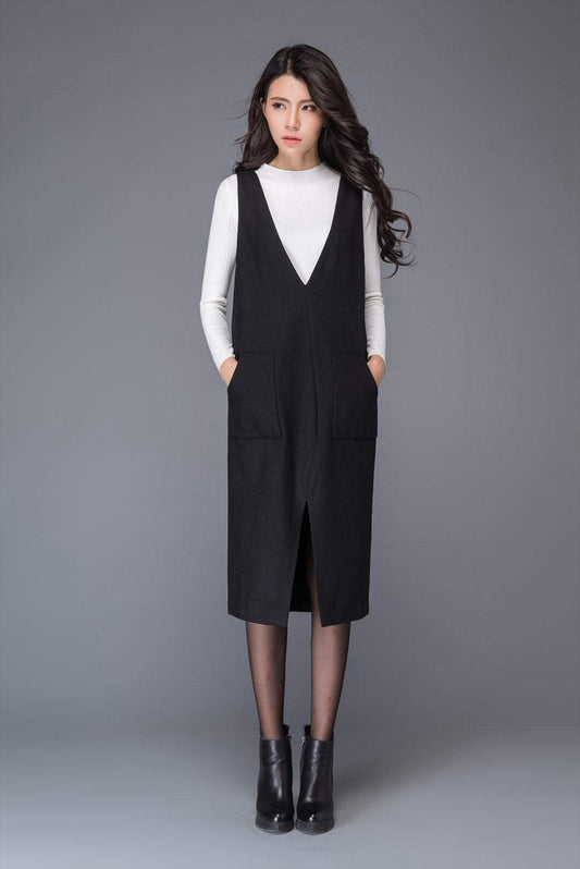 Black wool dress, strap dress, big V neck dress, winter dress, split dress, midi dress, women dresses, maxi dress, sleeveless dress C1009